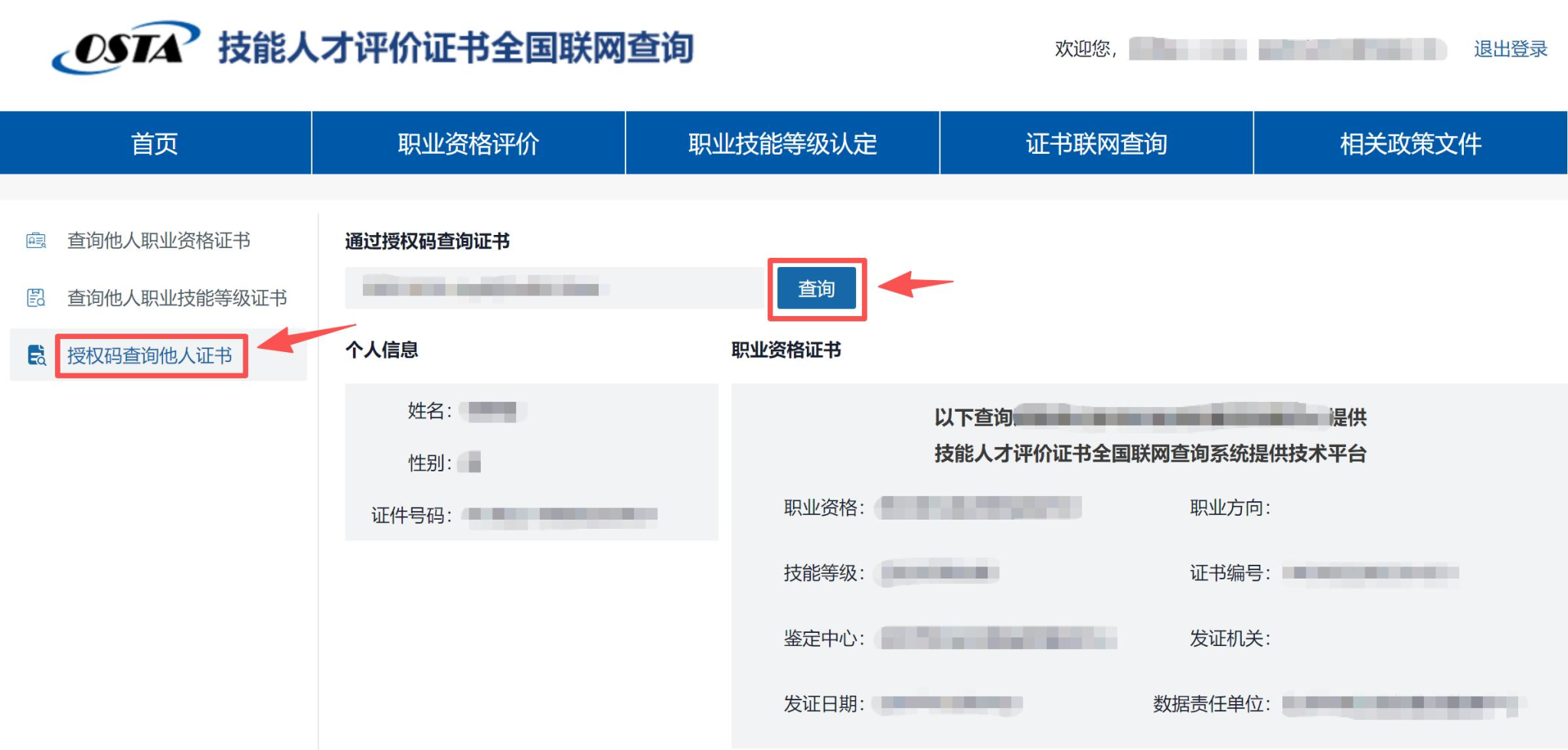 方式一:输入他人姓名、证件号码、证书编号,查询结果为脱敏信息。