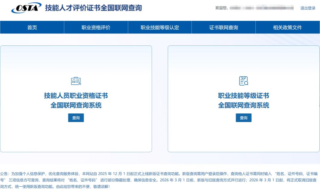 • 为进一步提升信息安全保护水平,优化用户服务体验,“技能人才评价工作网”已于2025年12月1日正式启用新版证书查询功能。